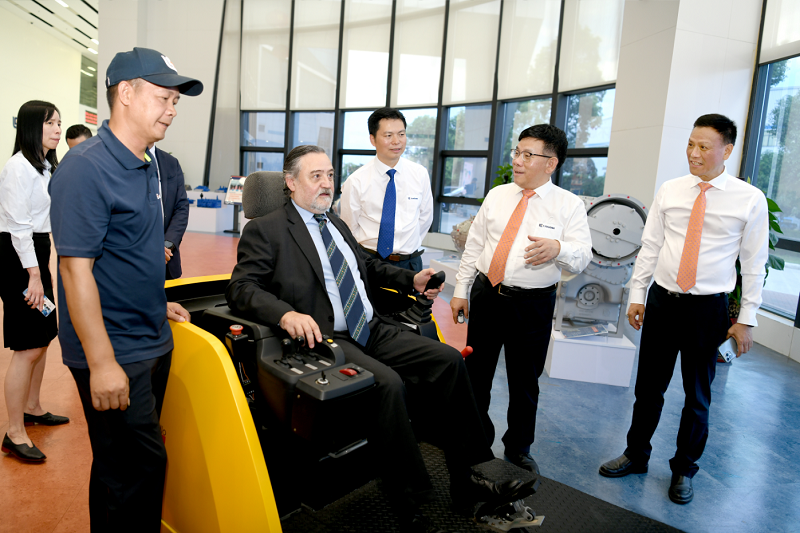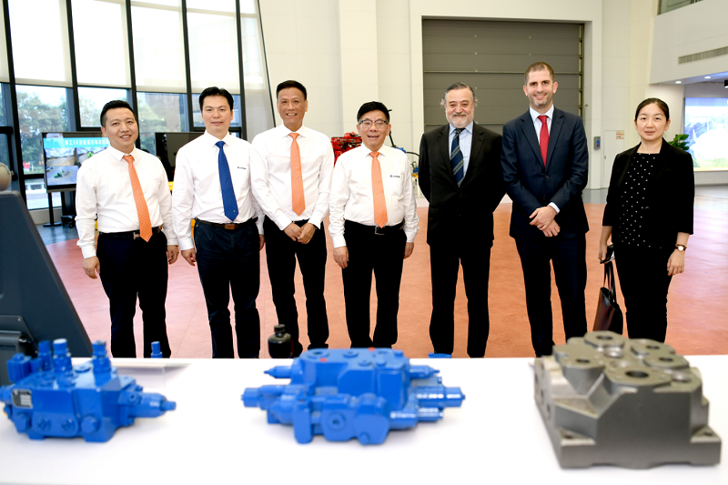 簽約儀式后,龔恩澤總領事一行參觀了柳工全球研發(fā)中心,曾光安介紹了柳工六十四年的發(fā)展歷程,以及柳工的全球化布局,海外產品銷售情況,還有柳工先進的研發(fā)技術和高質量發(fā)展。